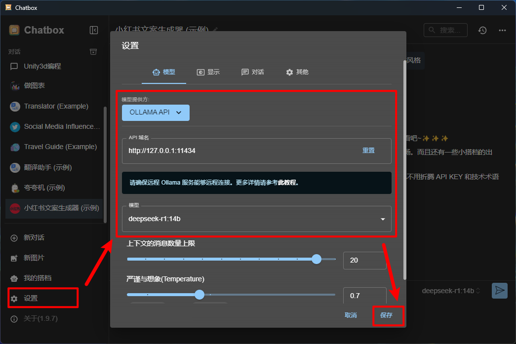 点击设置->模型提供方选择ollama api->设置模型为deepseek-r1->点击保存